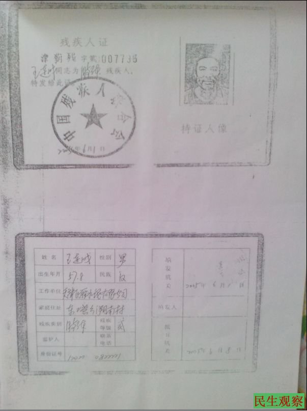 我是天津蓟县东二营乡潮南村村民王连成,今年57,身患二级残疾,是被乡派出所警察打残疾的。
