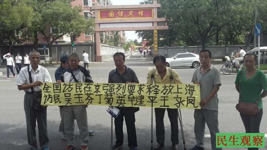 江西景德镇市访民彭中林和江苏吴继新、河北杨宗生、黑龙江孙东生、安徽李本才、徐新民、石新红、河南刘聚才、辽宁杨秀梅、周金霞、今天在国信宾馆前举牌呼吁,上海党政官员不要充当屠杀人民的刽子手,要求释放吴玉芬、丁菊英、毕建平、王永凤等人,然后购买了明天到杭州的车票。
