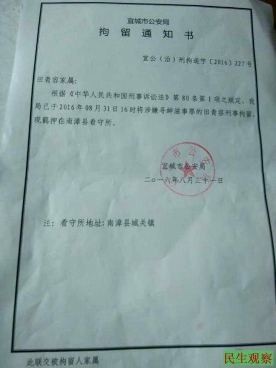 到杭州被拦截失联的湖北宜城访民田青容,家属接到通知,田青容于8月31日被宜城市公安局以涉嫌寻衅滋事罪刑事拘留,目前关押在南漳县看守所。