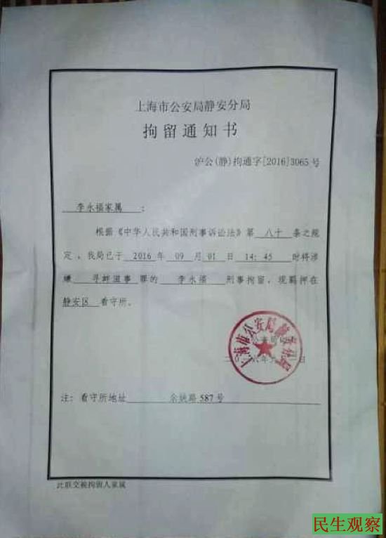 民生观察工作室2016/9/2消息:上海静安区访民李永福,因到杭州被截返后,昨日遭到静安分局以涉嫌寻衅滋事的罪名刑事拘留,羁押于静安区看守所。