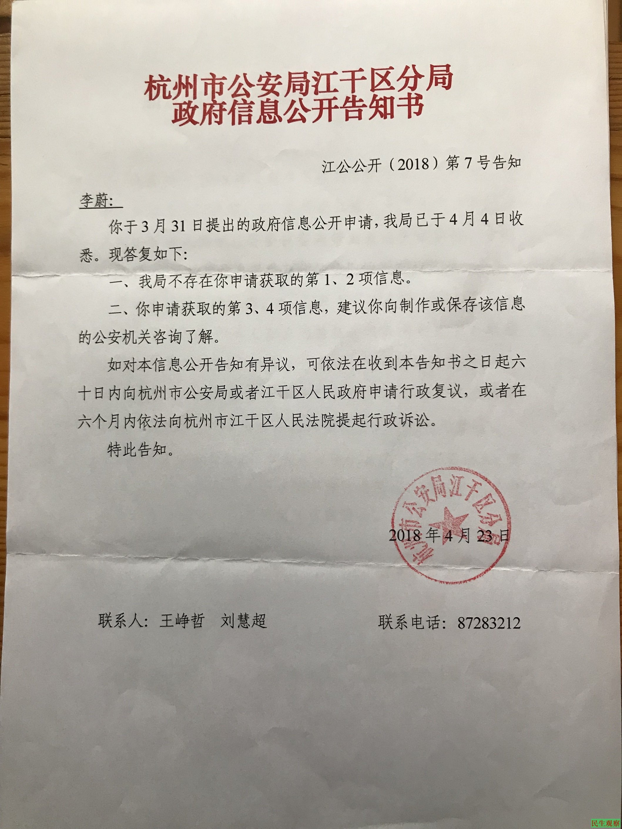 5.《杭州市公安局江干区分局政府信息公开告知书》(江公公开(2018)第7号告知)复印件1张