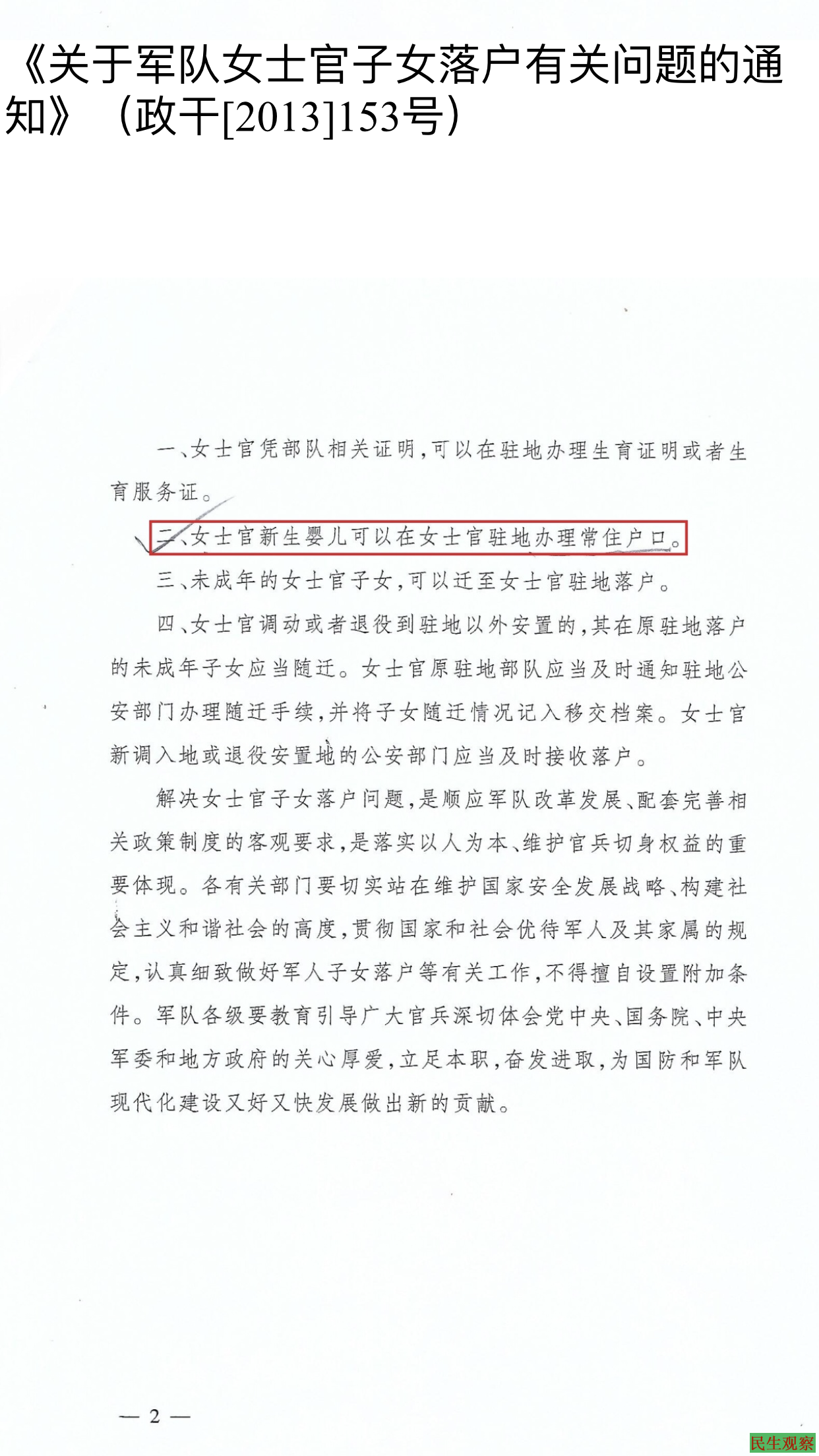 1、《关于军队女士官子女落户有关问题的通知》(政干[2013]153号)