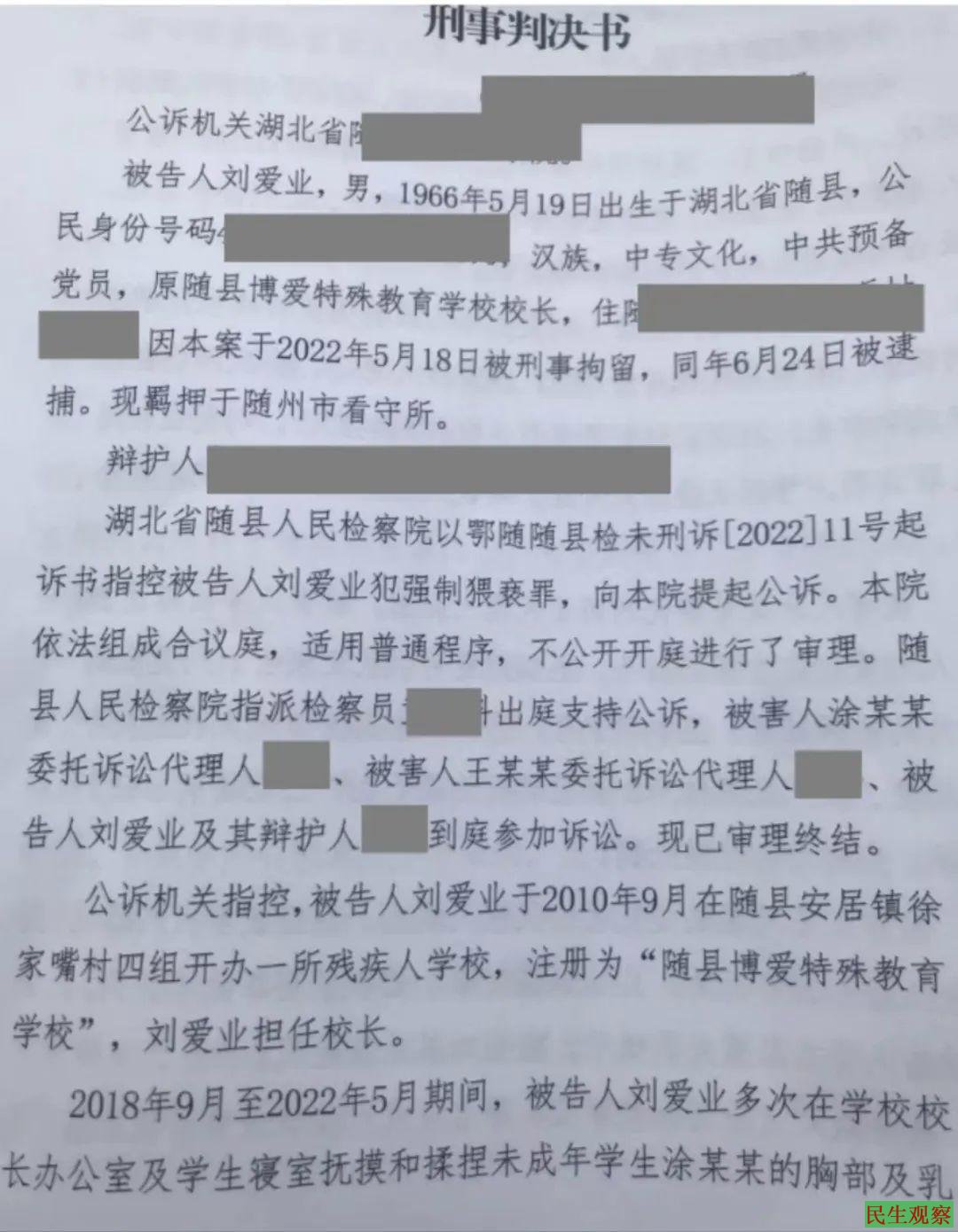 据新京报此前报道,2018年9月至2022年5月期间,湖北随县博爱特校校长刘爱业涉嫌性侵多名残障女孩。2022年12月,随县法院一审判决,被告人刘爱业犯强制猥亵罪,判处有期徒刑三年六个月;禁止从事密切接触未成年人的工作。