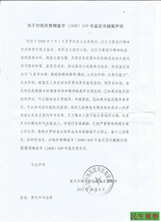 为了证明自己没精神病,王习章不间断的上访,索要鉴定结果,2012年8月王习章向罗田县公安局提出要求,重新做精神病鉴定,费用自理。罗田县公安局招架不住王习章的越挫越勇,不得已才委托湖北省精神病医院司法鉴定所给他做了精神病鉴定,鉴定结果为,无精神病,精神活动正常。2013年10月8日黄冈市精神病医院司法鉴定所才撤销了对王习章的精神病鉴定结论。