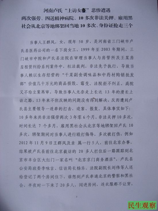 2011年12月14日,卢氏县雇佣社会人将在北京上访的王群凤直接拉到洛阳精神病院秘密关押,家属联系不上她后,多方打探,先后到县政法委、信访局等寻找,他们给出的答复均是不知道。20多天后,家属找到了该医院,然而院方给出的答复也是没有此人,经过家属继续寻求逼问,并证实人在该院10病区后,医院才承认警方确实将她送来关在这里,原来卢氏县公安局城关派出所出了手续给当事人鉴定。这次经过家属努力,被非法关押28天后她获得了自由。