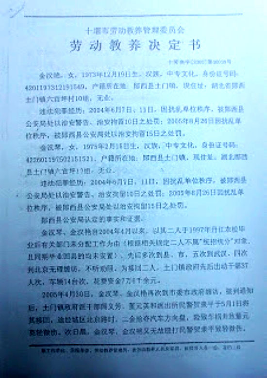 其后的2008年3月和8月,妹妹金汉琴又被关黑监狱两次计61天,关在土门镇政府内;姐姐金汉艳于2008年8月29日被从北京用囚车抓回,关黑监狱1次21天,被关在土门镇福利院内。