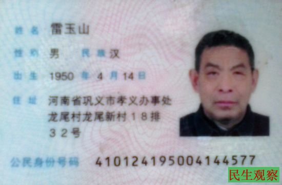雷玉山,今年65岁,是河南省巩义市孝义办事处龙尾村龙尾新村村民,因为上访被关精神病院17次, 2008年12月5日他被正式“任命”为“精神病患者”。政府还给他颁发了精神残疾证,残疾等级为二级。