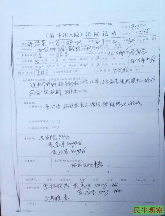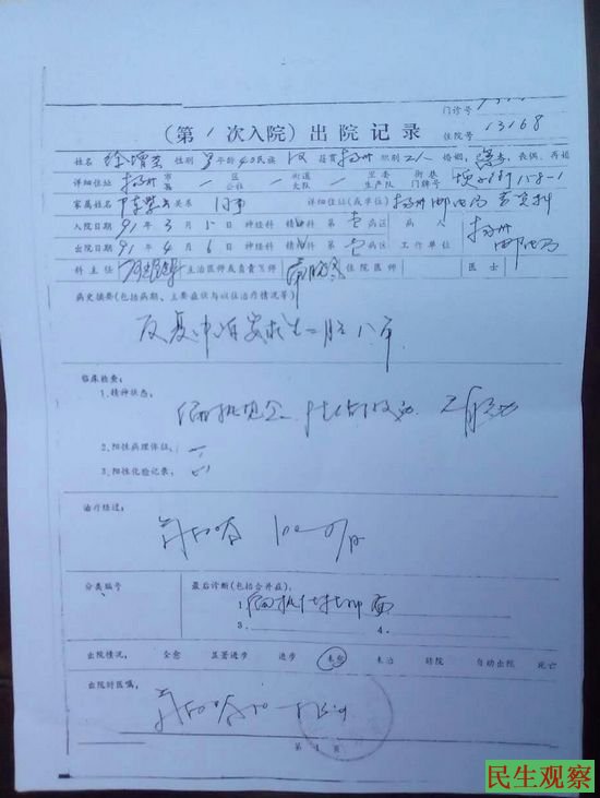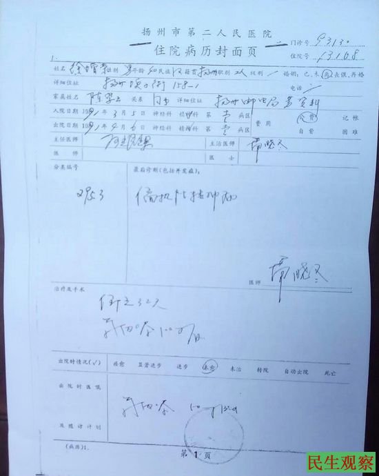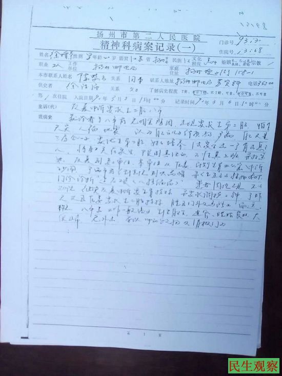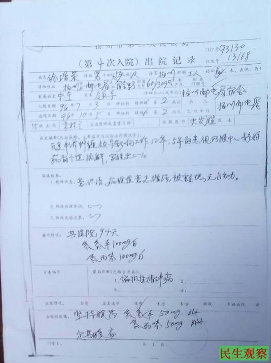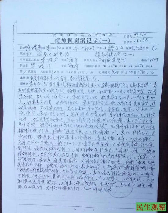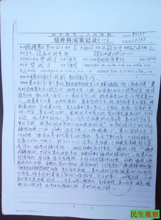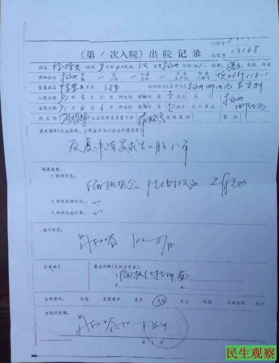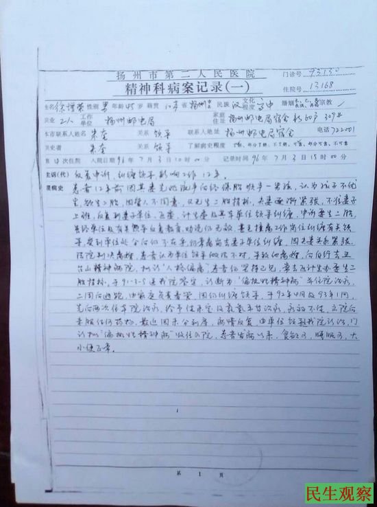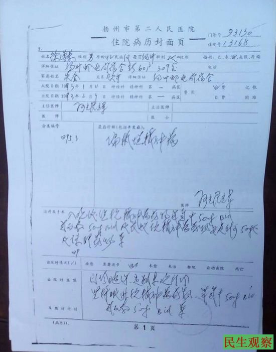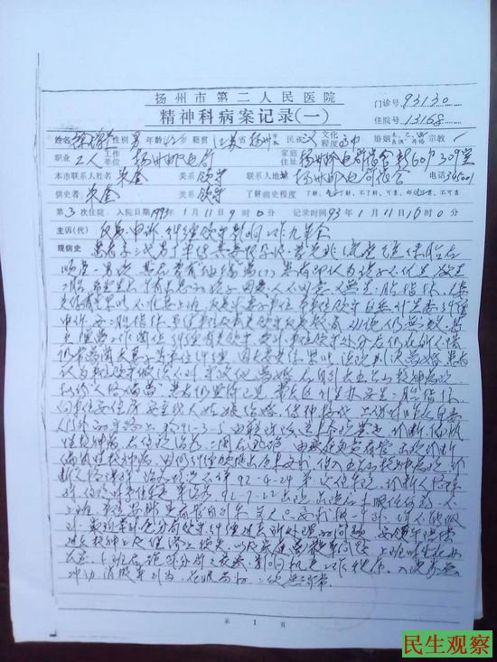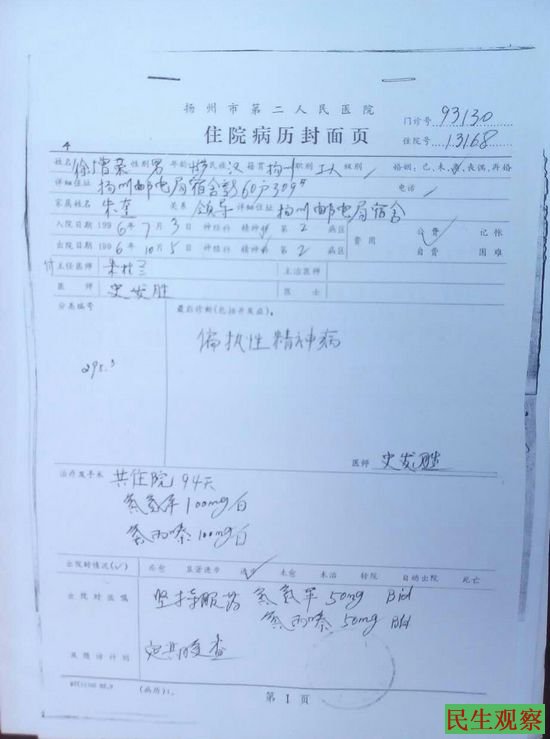 就是这个剥夺公民生育权的“国策”,激起了徐增荣维权的决心,当然也造成他以后5次被关精神病院的残酷迫害史。91年3月5日下午3点,他被送往扬州市第二人民医院精神科强行关押收治,并诊断为“偏执性精神病”。91年这个时间点,中国法制还非常落后,所以他所在单位在送他到精神病院后无所顾忌,赫然在家属联络人一栏填写的是同事陈紫云,他在关押一个月后的91年4月6日被释放出院。