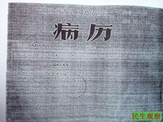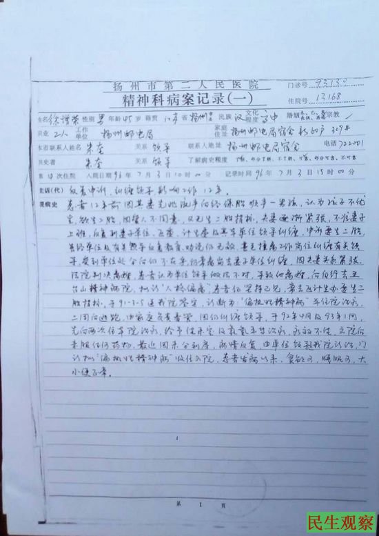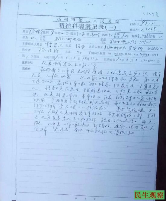 93年1月11日,徐增荣被送到扬州市第二人民医院精神科,亲属联络人一栏写的是邮电局领导朱奎,而主要诉说者也是朱奎。主诉的理由则是“反复申诉,纠缠领导影响工作9年”,于93年2月9日出院。