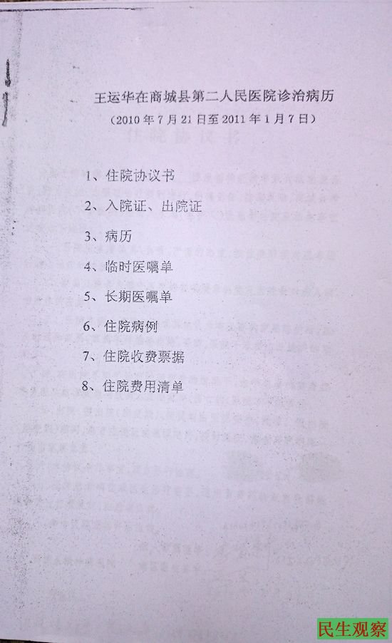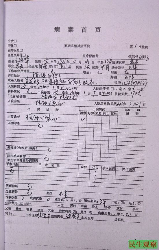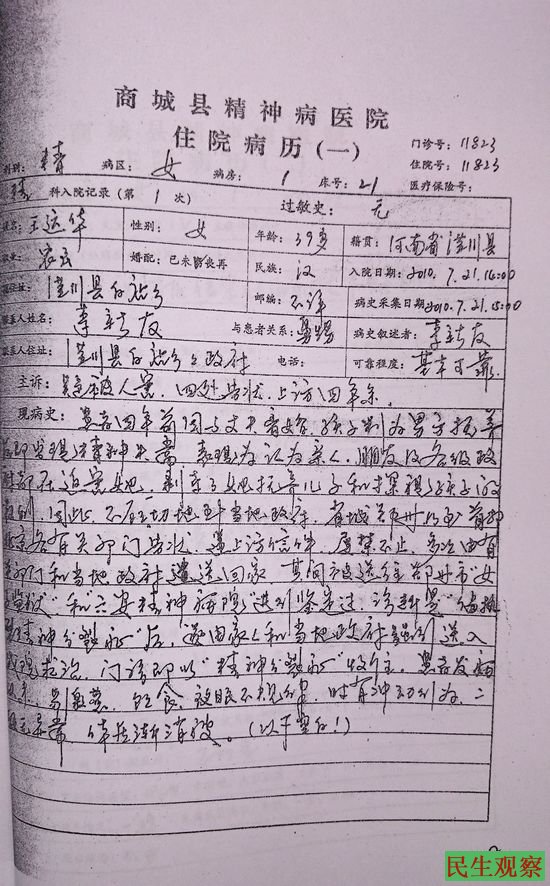 这些结论为当地维稳机构进一步迫害王运华提供的依据。2010年7月21日,由村支书李发新签字把她送入了商城县精神病院,该院的初步诊断病例处赫然写着“王运华因离婚导致精神异常,并以此为由到处上访告状,多次由乡政府押回,屡禁不止,初步断定——偏执型精神病”。到2011年1月7日放出来的时候,该院确诊她为“精神分裂症”。