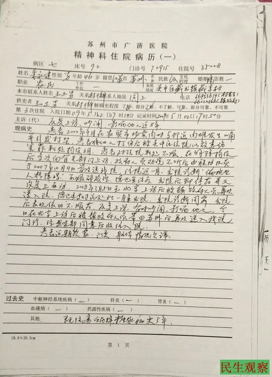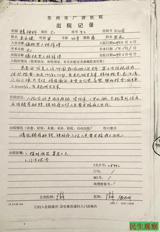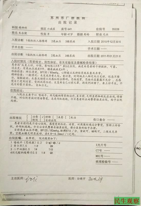 江苏省苏州市朱永健:从退役军人到“精神病”人