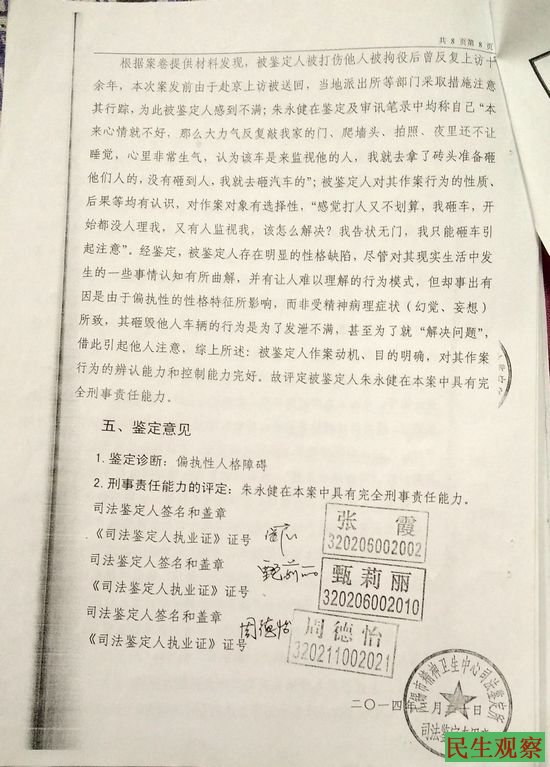 翻看朱永健的材料发现,《苏州广济医院司法鉴定所出具的多份医学鉴定书》和《无锡市精神卫生中心司法鉴定所出具的精神疾病司法鉴定意见书》中对朱永健的鉴定结论均为,偏执性人格障碍。