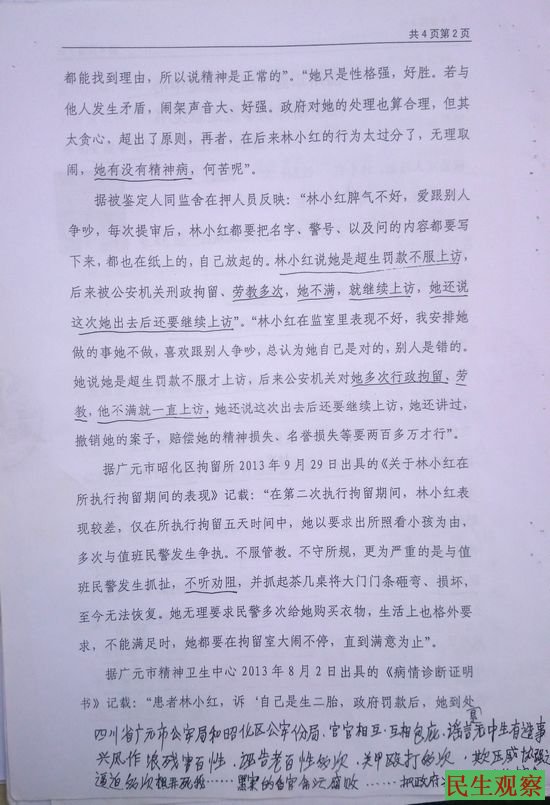 从此,林小红开始上访,被迫害的时代也慢慢来临,2009年6月因扰乱单位秩序被行政拘留10天,7月因扰乱单位秩序和阻碍执行公务被行政拘留10日,合并执行20日。9月初,正在北京上访的林小红,被四川驻京办从陶然亭西罗园地下室里抓住,随后,驻京办、镇政府和派出所李红(音)等人说给她回家解决问题,就把她带上车,回来的路上还强夺了她携带的所有材料,然后她并没有被送回家,径直被送往广元市第四人民医院精神科,进去后他们就让医生给林小红做各种项目的检查,检查完毕医生告诉他们“这个女士没有精神病,你们把她接走吧”。