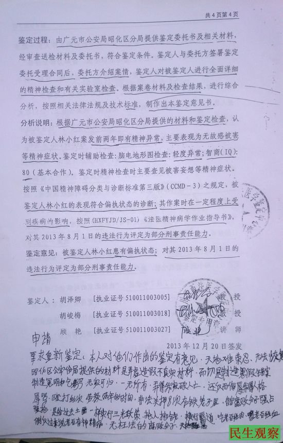 2013年8月2日,广元市精神卫生中心出具的《病情诊断证明》只有脑电图检查一项显示“轻度异常”,所以该院两次鉴定林小红没有精神病。而2013年11月19日,广元市公安局昭化区分局委托四川华西法医学鉴定中心给林小红做鉴定,鉴定材料全部由昭化分局提供的卷宗材料为依据,该院并断章取义的参考了广元市精神卫生中心的“轻度异常”,出具的司法鉴定意见证明,林小红患有偏执状态。此鉴定不仅打开了日后林小红被精神病的大门,同时鉴定林小红8月1日的表现具有部分刑事责任能力,更是打开了对她判刑的大门。