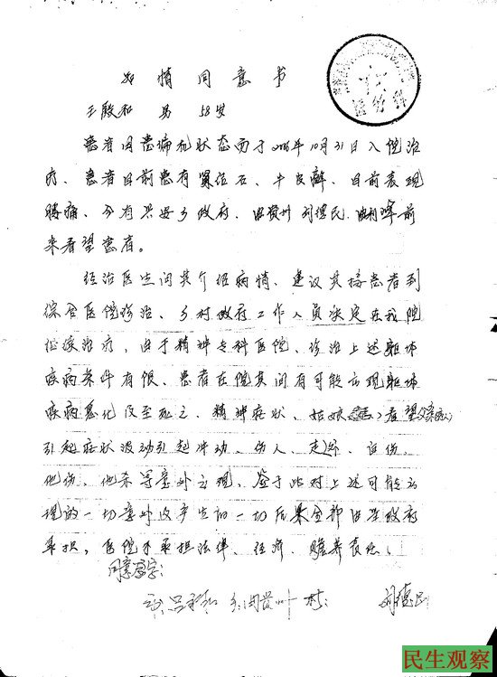 10月31日五大连池市信访局、乡政府和五大连池市公安局一起把他送到齐齐哈尔市富裕二道湾精神病医院,上述部门明知他患有肾结石和牛皮癣仍和精神病院签了免责协议,让其随意治疗。 2013年12月24日市信访局和乡政府的人才把他接出来。