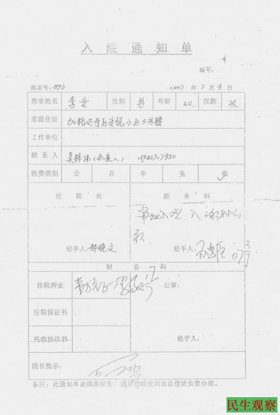 当天下午我大姑连夜从哈尔滨赶回了加格达奇 我们找了法院、派出所、社区,他们说得安康医院那边出证明,就这样两边推。 2010年4月份的时候我从家里拿了500块钱,自己孤身一人跑到了哈尔滨 ,那年我14岁,找到了安康医院,见到了我的父亲,当时眼泪就没忍住流了下来。2010年7月13日安康医院打来电话说我父亲(李安)不行了,你们家属来接人吧。我大姑跟我叔于 2010年7月14日到哈尔滨从安康医院将人接出送往解放军211医院抢救治疗了 37天。