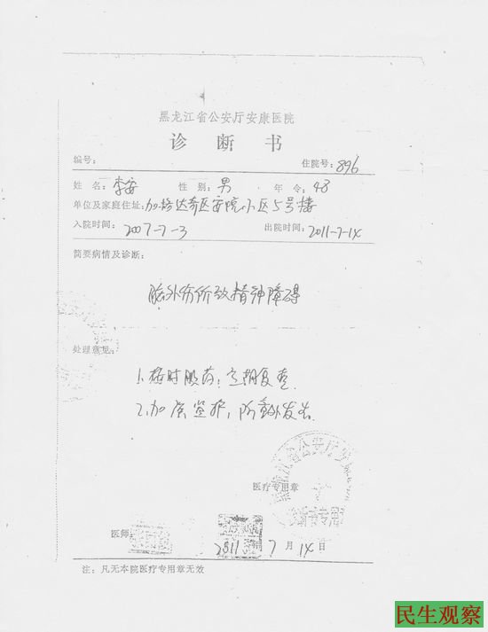 2007年7月3日零晨4点把我从看守提出来后,以省信访主任找我谈话为名,把我押送到黑龙江省公安厅安康医院。其中有个光头民警说:“看你还敢上北京去上访吗?” 当时在医院加格达奇公安局民警强行叫我社区书记杨影、社区委主任签字。