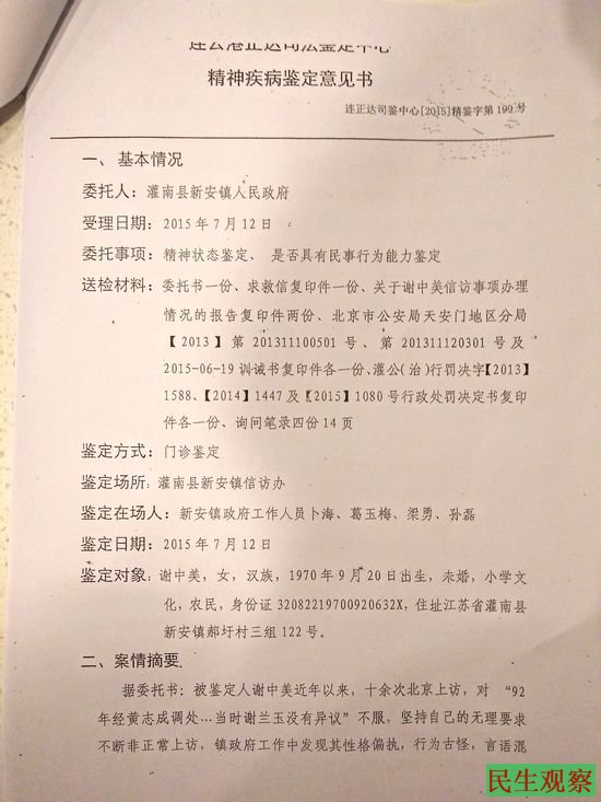 就在谢中美在医院受罪的时候,镇政府给她弟弟送去了连云港正达司法鉴定中心出具精神司法鉴定书,她的家人这才知道了谢中美被关在精神病院。9月9日谢中美随家人离开了医院。
