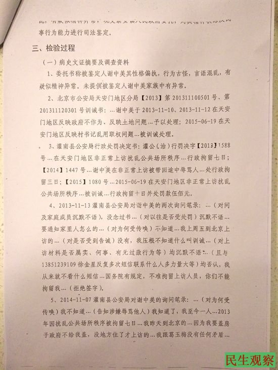 查看连云港正达司法鉴定中心出具的司法鉴定意见书发现,委托鉴定的是灌南县新安镇人民政府,镇政府提供了谢中美的上访材料、信访事项办理情况的报告和训诫书及处罚决定书作为鉴定谢中美有无精神病的依据。