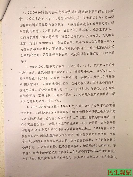 谢中美则认为,她不是差那点地,是因为她实际分到的地比村里账上登记的少,这是弄虚作假。虽然经村里调解,但谢中美对此一直不满,并十余次进京上访,反映村干部弄虚作假,把她应得的土地送了人情,给了她的邻居。