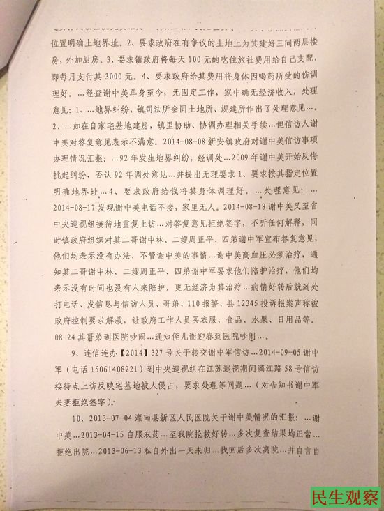 8月份谢中美听说中央巡视组到了省里,她就又赶去上访,8月18日被镇政府的人接回去就又送到了灌南县第二人民医院,这是个治疗精神病的医院。进去后她被单独关在一间屋子,每天有人看着不让她出门,9月8日才让她出来,谢中美说,出来时就想喊,“我自由了”!