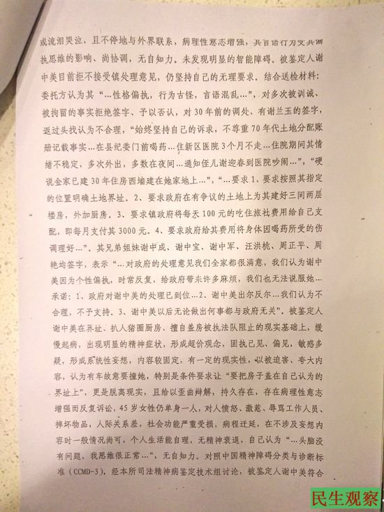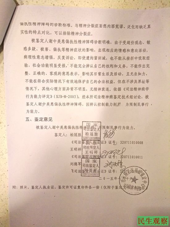 鉴定结果为谢中美患偏执性精神障碍,限制民事行为能力。