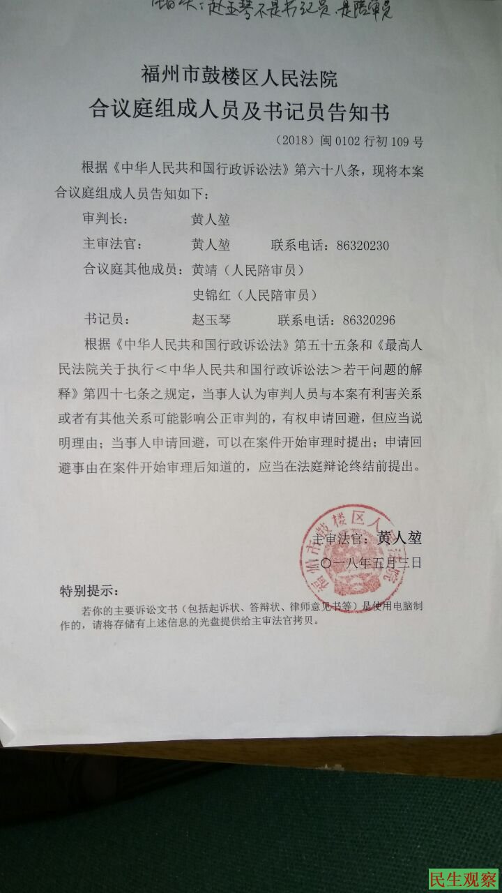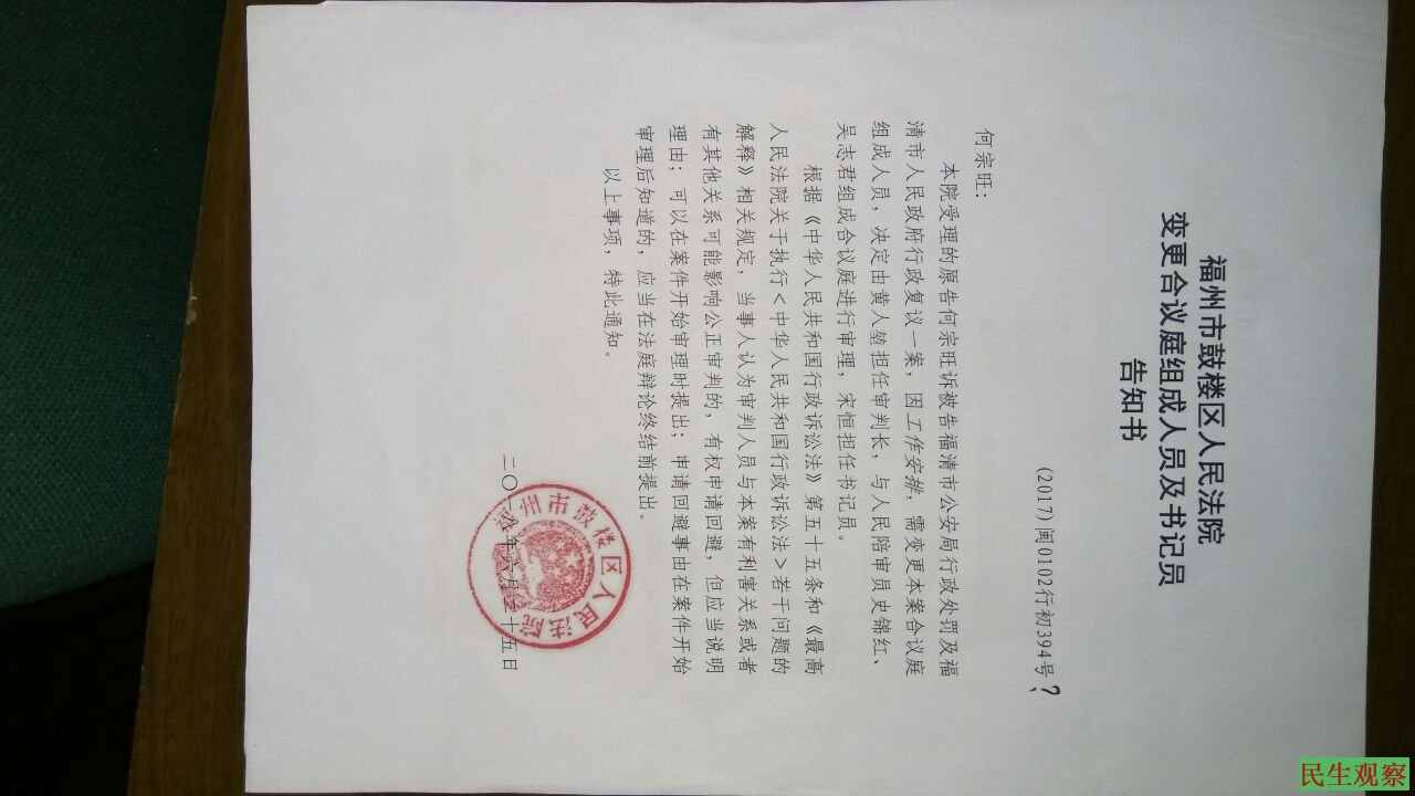 有关本案,何宗旺表示他起诉到鼓楼区法院后,法官黄人堃还故意将之前于2018年5月3日发出的合议庭成员告知书(2018)闽0102行初109号,把书记员名字宋恒写成赵玉琴,人为造成他无法正常和书记员联系。何宗旺把情况反馈给法官黄人堃后,法院重新送达了变更合议庭成员告知书,但却把文号故意更改为(2017)闽0102行初394号。法官黄人堃如此故意刁难原告何宗旺的做法,让何宗旺不知法官要审理哪个案子?(何宗旺诉公安及政府违法拘留,目前有多个案子已被鼓楼区法院受理,而且审判长都是黄人堃)。