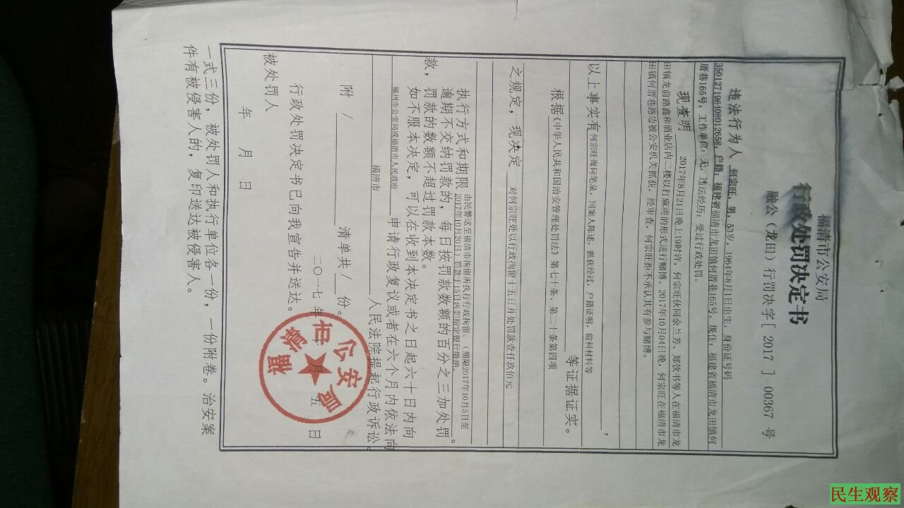 据何宗旺介绍,他于2017年5月12日在福州火车站准备乘Z60火车前往北京,在候车室莫名其妙遭到福清公安抓捕。当时因为北京正在召开国际“一带一路”会议,何宗旺后被公安以莫须有的所谓“诽谤罪(诽谤中央领导)”构陷拘留15天。