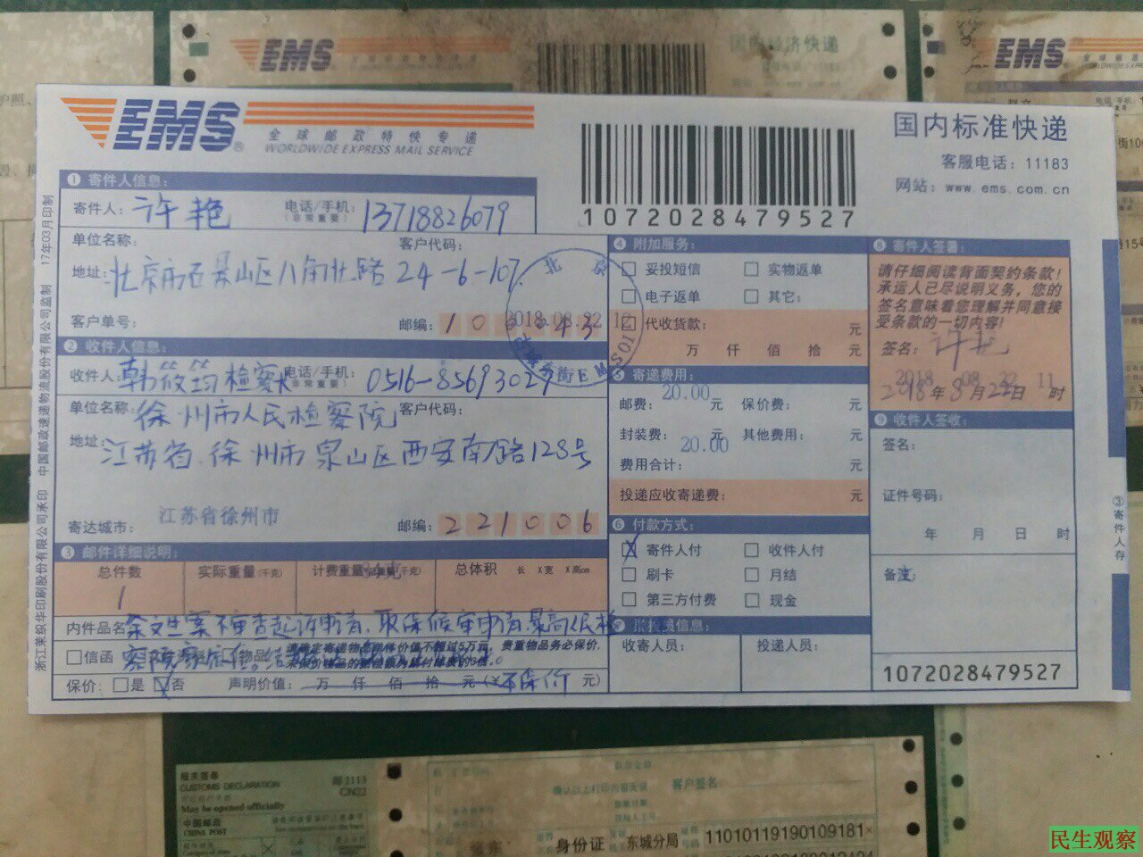 今日,余文生律师的妻子许艳女士向当局提出申请,要求当局不起诉余文生,并冀望丈夫能够获得取保候审,尽快被释放回家,与家人团聚。上午十一点,许艳女士在北京石景山区八角北理邮局将两份申请文书(不起诉申请书及取保候审申请书)通过邮政EMS特快专递邮寄给江苏省徐州市检察院。