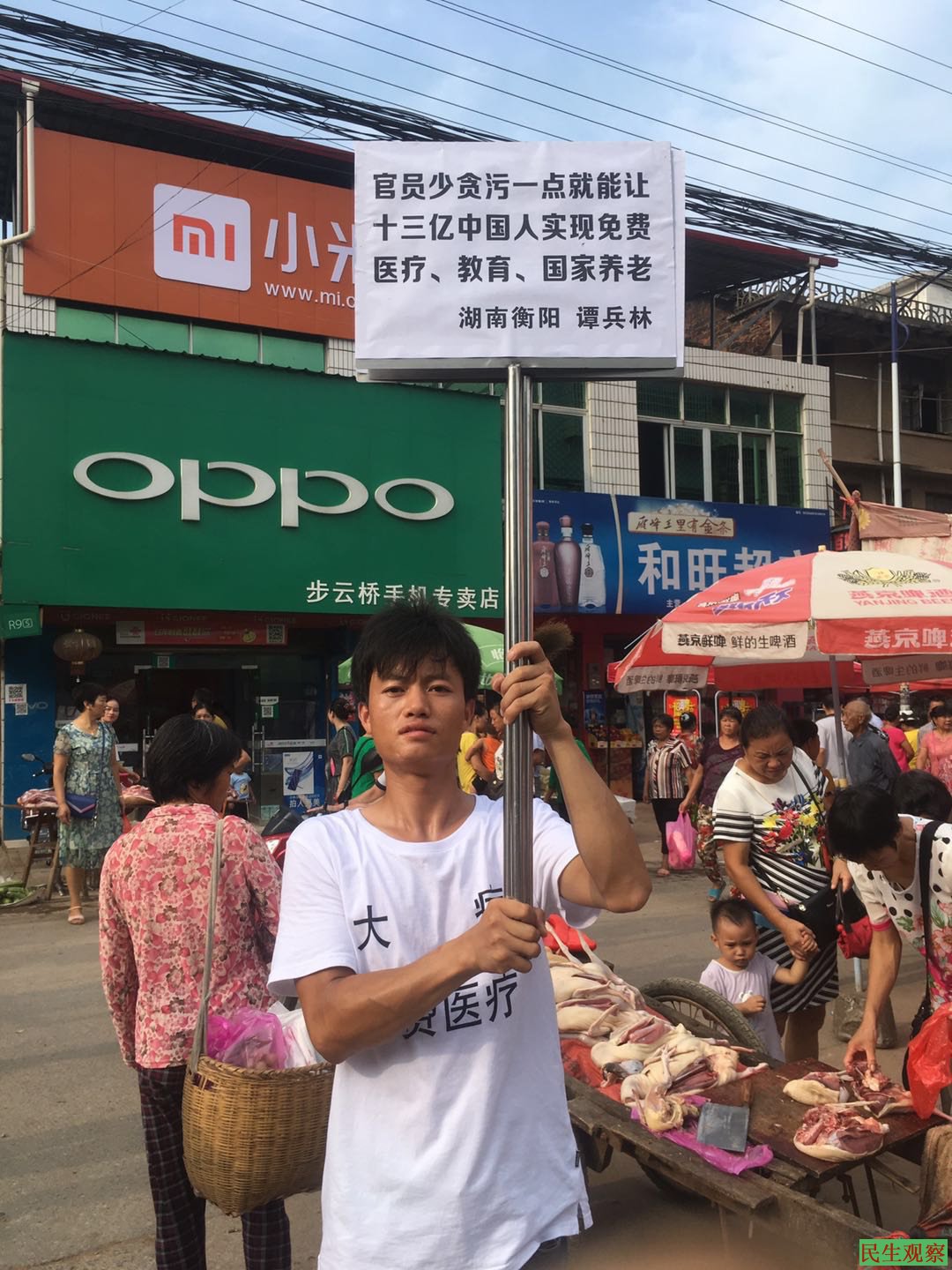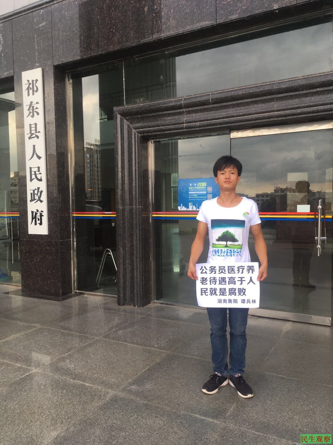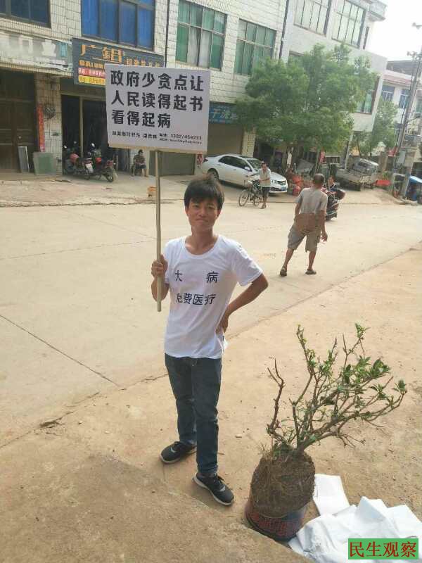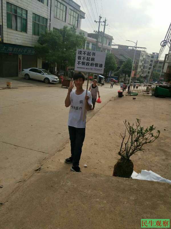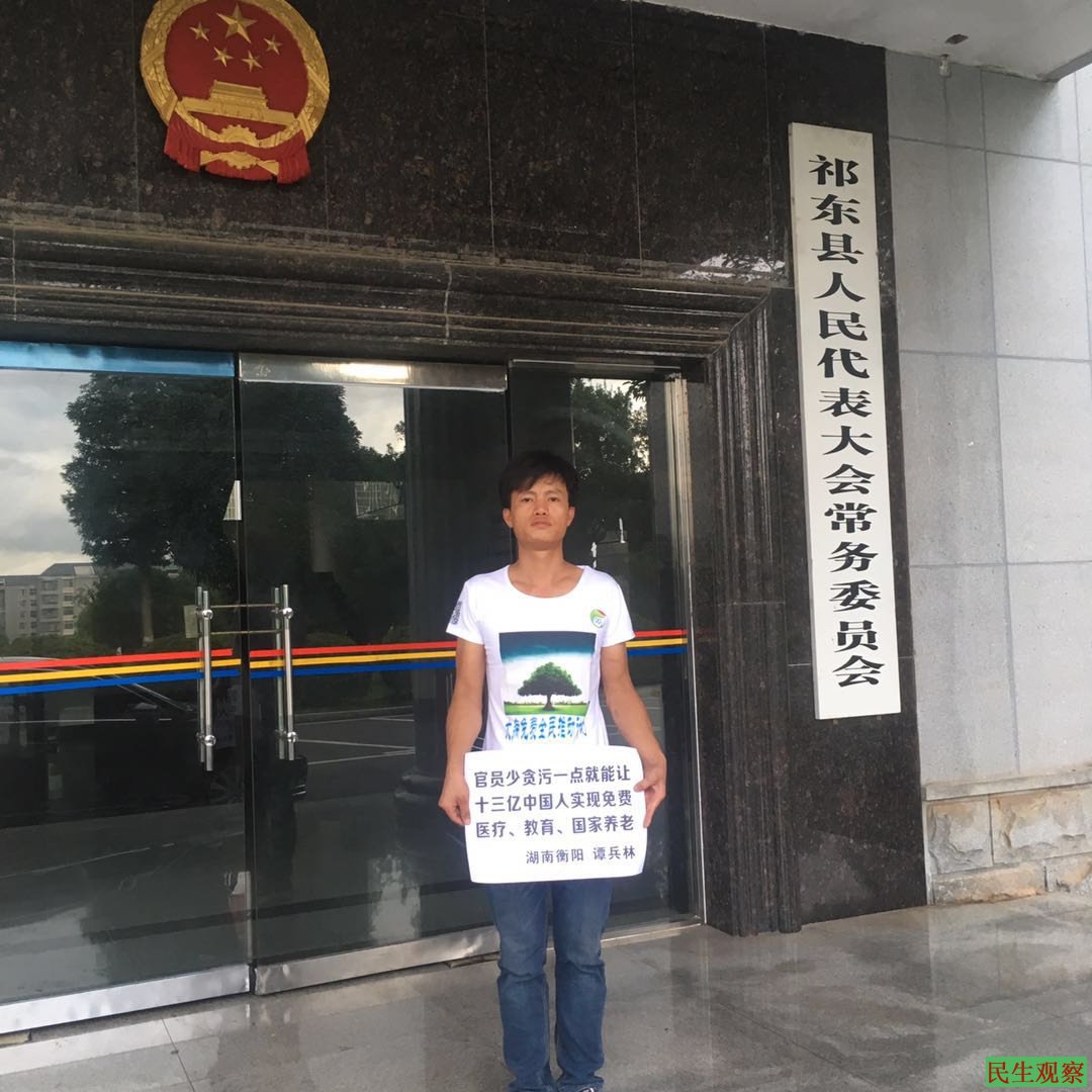 【民生观察2018年9月5日消息】本网获悉,湖南祁东维权人士谭兵林因于闹市举牌要求“三免”(免费医疗、免费教育、免费养老)等诉求而被当地警方控制,在短暂自由后再次被国保带走拘捕,目前情况未明。