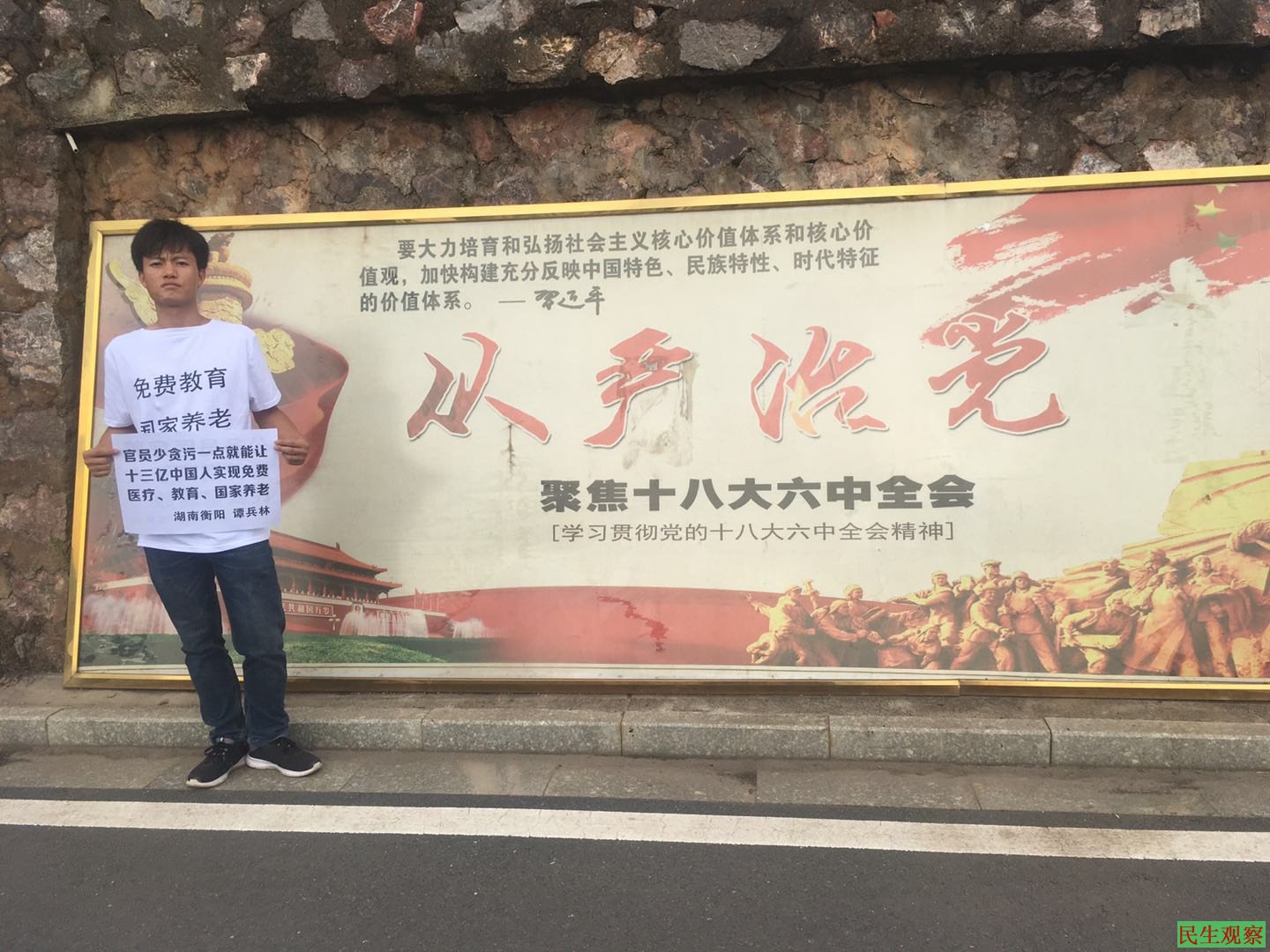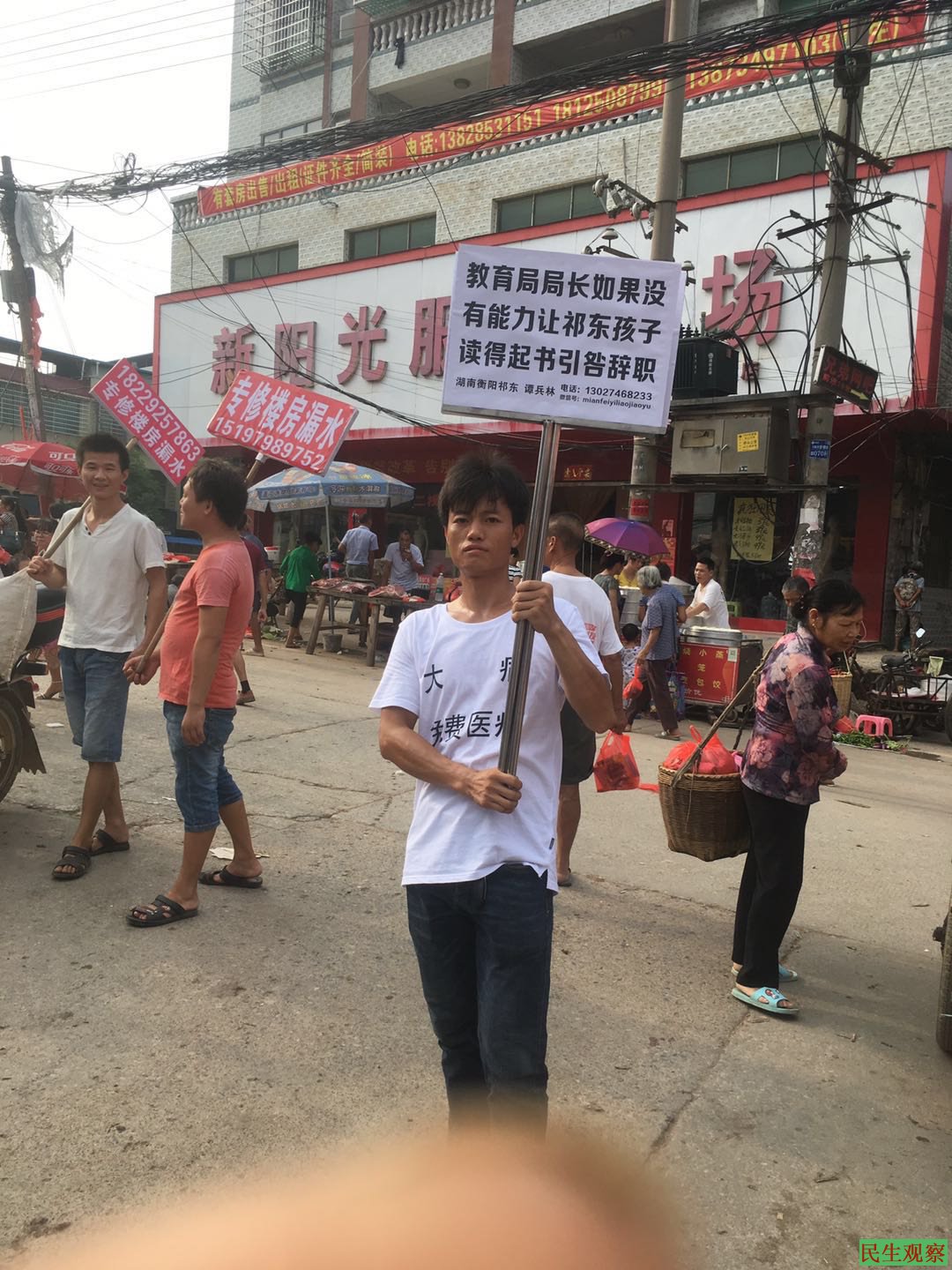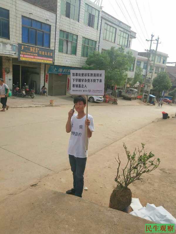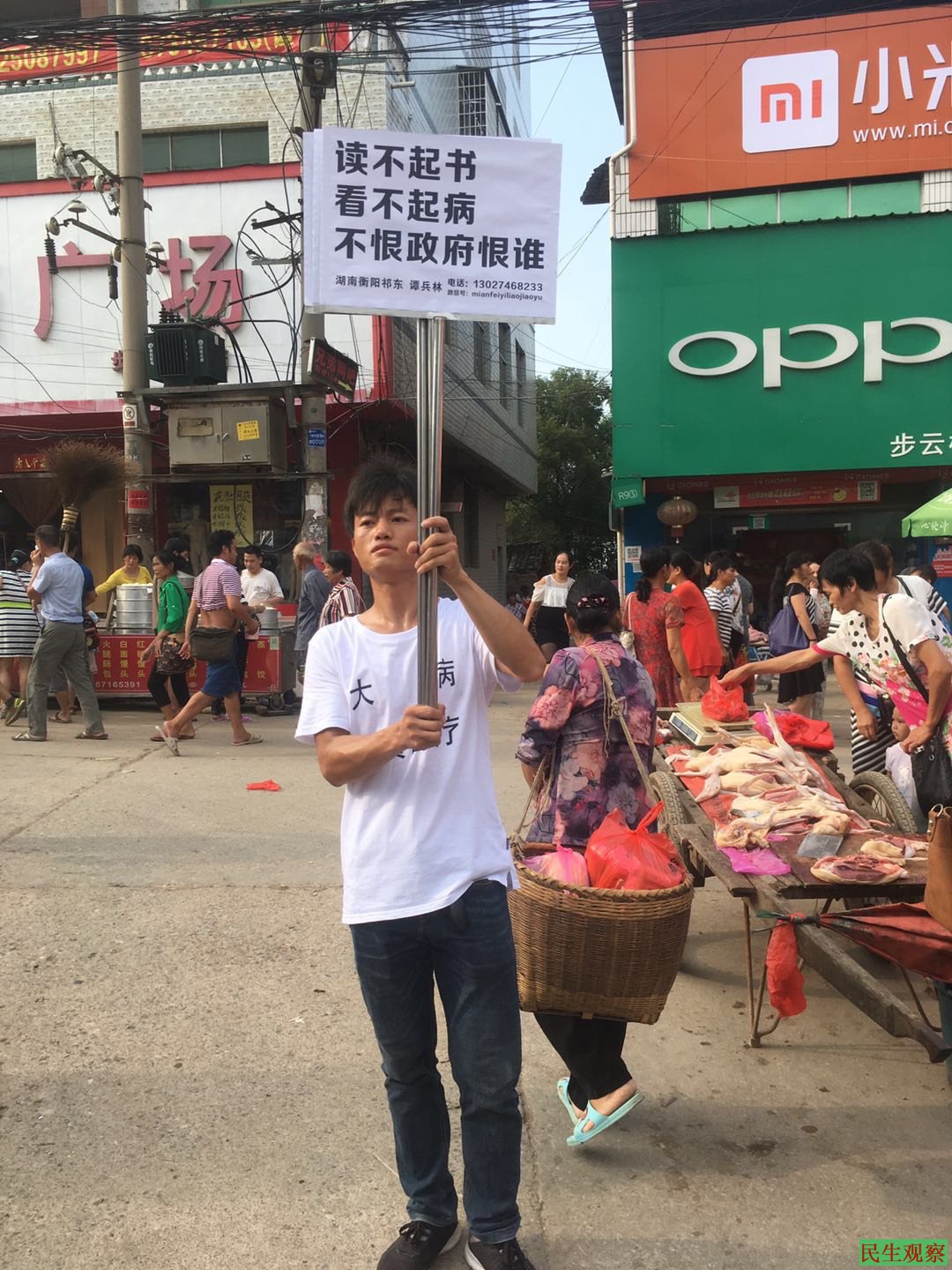 【民生观察2018年9月5日消息】本网获悉,湖南祁东维权人士谭兵林因于闹市举牌要求“三免”(免费医疗、免费教育、免费养老)等诉求而被当地警方控制,在短暂自由后再次被国保带走拘捕,目前情况未明。