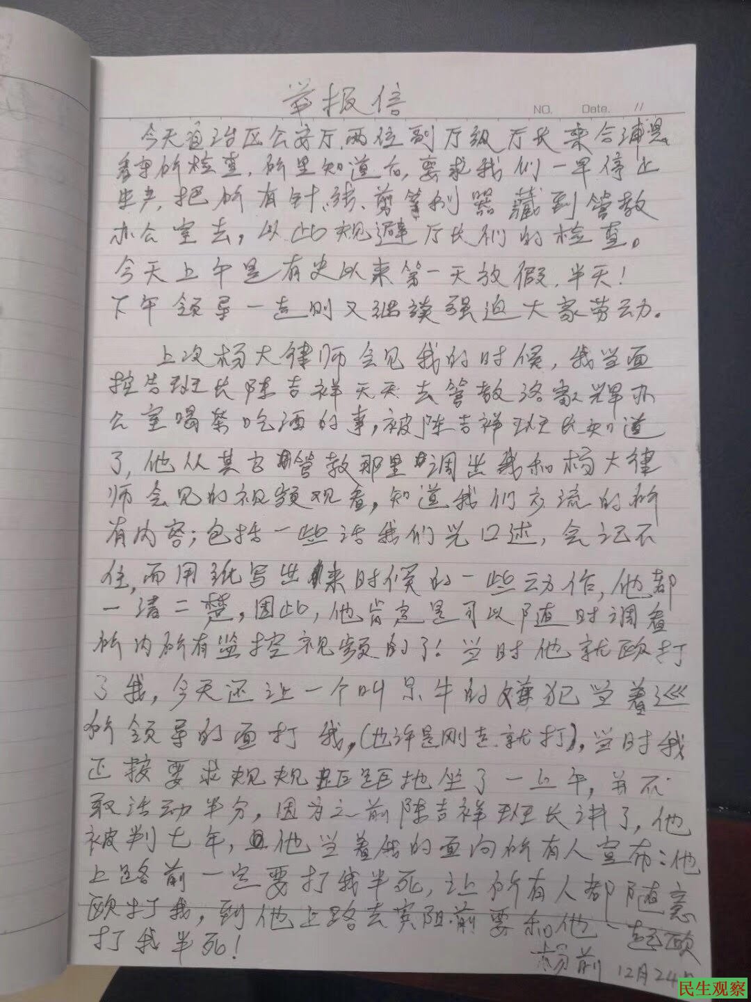 【民生观察2019年1月7日消息】广西合浦县维权人士杨前被控“寻衅滋事罪”遭秘密审判获刑两年,案件后被发回重审。近日,其通过辩护律师再次传出消息,羁押在合浦县看守所的杨前持续受到虐待和殴打,杨前递交多封举报信亦无果。
