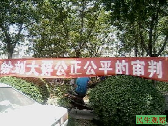 各地闻讯而来的民众则有约数百人之多,他们齐聚中院门前的街道旁声援刘大孬,他们打着各式标语,要求法院不能给地方政府和强拆方“护短”,要求对刘大孬一案 “公正、公平、”的进行审理。庭审在11:30左右结束,今天的庭审结果并未当庭宣判。