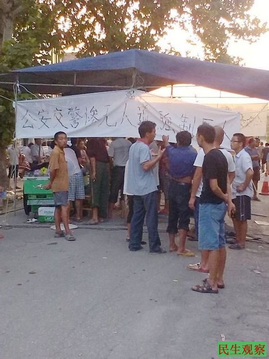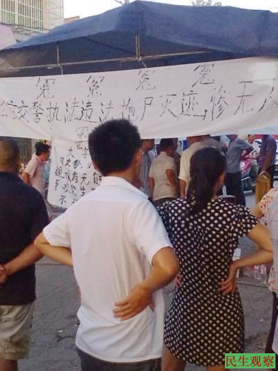 民生观察工作室2013-8-6消息:8月3日,湖南省湘乡市育塅乡一辆轿车与一辆摩托车相撞,发生车毁人亡的惨剧,死者是一名14岁的男性学生。本工作室电话联系了死者的姐姐,据她口述,事故发生之时,她的弟弟还一息尚存并未死亡,而肇事方没有依法报警及抢救伤者却逃离现场,并且最后带人来“抢尸”才致使其弟最终死亡。据悉,肇事者的家就住在当地某警方的隔壁,肇事者欲联合公安交警将其弟弟以掩人耳目的方式处理掉,而死者的监护人当时又不在家,在外地打工。于是,附近村民纷纷前来愤怒的讨要说法并且包围了前来运尸的车辆,在百姓群情激奋的声讨下,有关部门就把尸体从车上丢了下来,在丢下尸体的瞬间,死者的鼻子都被摔掉了。为了防止肇事者及有关部门再次来抢尸,村民们自发的在事发地点搭起了帐篷,拉起了横幅,上书“公安交警惨无人道 强制压人”等标语,一直守护到第二天中午11点多,最后,政府部门终于来人答应赔偿35万元,村民们才允许将尸体运走。