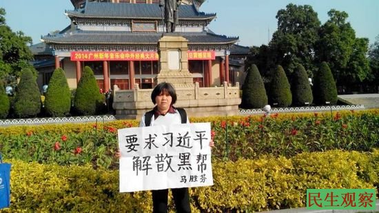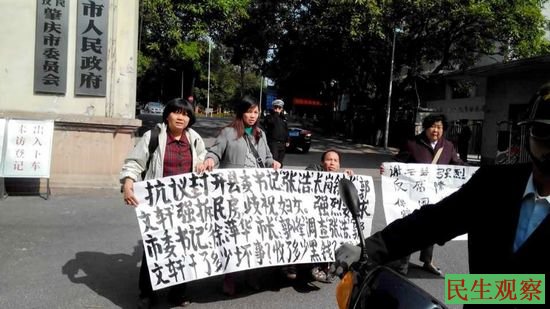 民生观察工作室2013-12-26消息:昨天下午,广东省肇庆市封开县长岗镇访民黄燕雯,与维权人士马胜芬、谢云碧等人一同来到肇庆市政府门前举牌抗议,谴责封开县委书记张浩、镇长郭文轩强拆民房、殴打村民,并谴责政府官员违法歧视妇女,要求习近平解散黑帮地方政府。