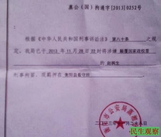 据悉,赵枫生先生生于1977年,湖南永州瑶族自治县人。新婚不久,育有一不到一岁的幼女。他曾于数年前联合了全国五十多位农民,发起成立了“中华全国农民协会”,并向民政部递交了成立申请未果。而后,他在北京发起成立了“青年农民工夜校项目”,并在其后入选了《南方周末》举办的“温暖中国活动”。他还创建了《中国农民网》,发表了大量关注农民和农民工生存问题的文章。由此,他被北京警方驱赶出京市。在他被驱逐出京回到湖南老家后,他又成立“农民合作社”,后因资金问题而关门。其后,他不得不在湖南衡阳以开三轮摩托车为生,而在他驾驶三轮车谋生的过程中又时常遭到城管部门的驱赶,为此,他常叹民权不彰、民生多难。于是,他又在其后撰文宣布放弃大陆居民身份,申请加入台湾中华民国国籍。在今年下半年,他又开始创作民主维权歌曲,为在京被捕的维权人士王功权鸣不平。在2013年11月之际,他又在网络上发异见文章《北伐檄文》。11月28日上午9点,他被警察从家中带走,并抄走了家中的电脑。29日,其家人收到了对赵枫生的刑事拘留通知书。在湖南衡阳市公安局蒸湘分局出具的《刑事拘留通知书》上显示:根据《中华人民共和国刑事诉讼法》八十条之规定,将涉嫌颠覆国家政权罪的赵枫生刑事拘留。时间为2013年11月28日22时。目前赵枫生被羁押在衡阳县看守所。