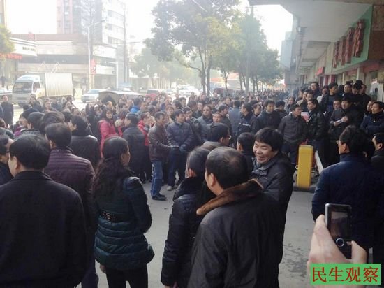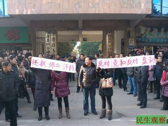 民生观察工作室2014-1-14消息:昨天(1月13日)上午,湖北省荆门市沙洋县的千余名教师陆续聚集到沙洋县政府门口示威抗议,到场的老师们高举着“反对盘剥,反对克扣,还我血汗钱”的横幅分四个团队涌到了县委的门前。随后就来了很多警察,他们分两派五六米一个。据荆门维权人士刘女士和沙洋维权人士王女士反映,昨天沙洋县部分教师在县政府门前示威抗议,要求按政策增加工资。上午10点只有一两百人,后来人就越来越多。据说,有个学校大门被校长锁住了,老师们翻院墙赶往城区。昨天沙洋县政府有人演讲,附近的交通都因此被阻断,据悉还有一辆交警车被掀翻。教师们说,沙洋县委、县政府的官员们曾要求公安、教育、文化、政府等部门的干部去阻挠、劝解老师们不要参与罢课抗议,结果有些去劝解的干部私下里却对老师们说:“你们继续请愿吧!你们涨了工资,我们也好跟着涨。”教师们的罢课抗议事件一直持续到昨天旁晚,今天教师们在等待县政府的答复。