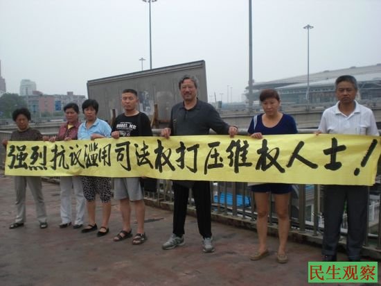 民生观察工作室2014年6月19日消息:今天,针对近期多名维权访民被无辜关押、判刑,河北蔡志国、裴富贵、河南张素珍、王金兰、江西徐大金、辽宁王福娜等人在北京南站打出了要求释放维权人士的横幅。