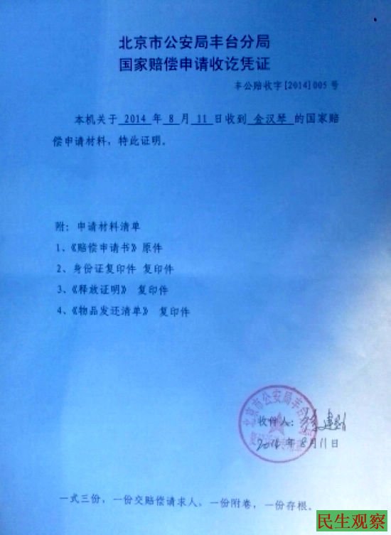昨天金汉琴接到丰台警方电话,让姐姐金汉艳另行申请国家赔偿,并让她去拿国家赔偿申请收讫凭证。今天一大早金汉琴就到西城分局接待大厅更换赔偿申请。