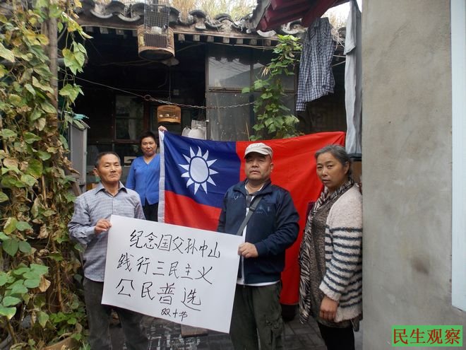 民生观察工作室2014-10-9消息:明天是台湾双十节,今天上午,在北京的维权人士叶国强、杨秋雨、王玉琴等在北京西城百顺胡同39号叶国强的家前,打出标语和旗帜,纪念国父孙中山,呼吁践行三民主义。
