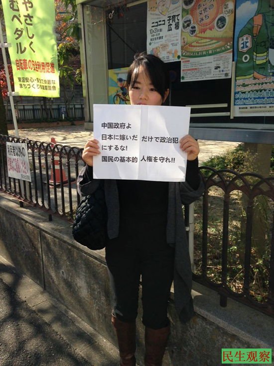 民生观察工作室2014/11/23日消息:21日,江苏省金坛市公民杨彩英,在中国驻日本名古屋领事馆前举行抗议活动,以表达她对江苏省金坛市的多个政府部门,违法强征强占村民土地房屋,严重侵犯公民合法权益的行为深为不满。结果招致江苏地方当局报复其在国内的家人,年迈的父母及妹妹杨丽三人被警方带走,22日早晨6点传出消息,杨丽被以“袭警”罪名拘留7天。