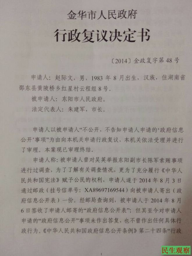 民生观察工作室2014年11月24日消息:中国公民赵际文于2014年8月3日通过挂号信向东阳市政府邮寄了一封“政府信息公开申请表”要求东阳市政府依法公开关于吴英举报东阳市副市长陈军索贿的调查情况,由于没有收到答复,违反了《中华人民共和国信息公开条例》第二十四条“行政机关收到政府信息公开申请,能够当场答复的,应当当场予以答复,行政机关不能当场答复的应当自收到申请之日起15个工作日内予以答复;如需延长答复期限的,应当经政府信息公开工作机构负责人同意,并告知申请人,延长答复的期限最长不得超过15个工作日。”的规定,向金华市政府提起行政复议。