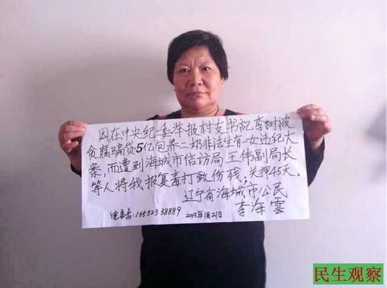 据李海云称,她是辽宁海城大屯镇的一位访民,她在多年前因到北京中纪委举报她们村书记李树波,涉嫌骗贷5个亿,包养二奶且非法生育一女的大案,而被海城市信访局副局长带领多人到北京来将她殴打致残,随后她又被这些人非法截访回辽宁海城市,将她非法关押45天。
