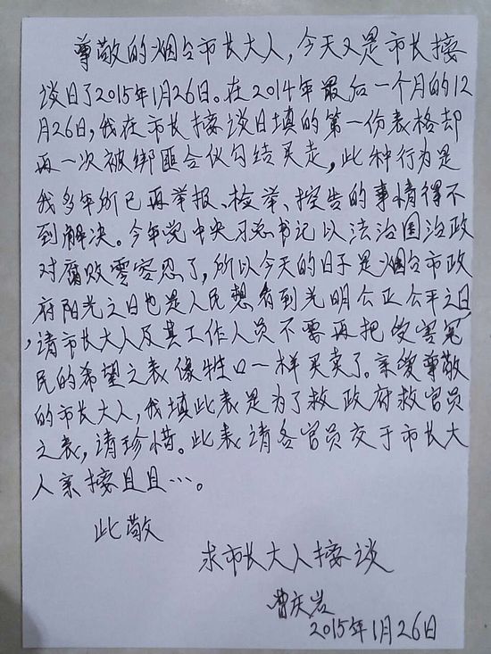 烟台市长接待日 曹庆岩控诉其为假大空作秀
