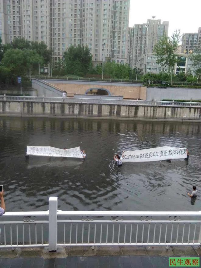 九名辽宁鞍山农民工北京跳入河中拉横幅讨薪