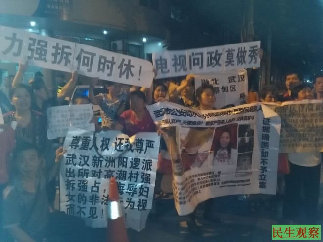 据现场访民介绍,昨天晚上到达武汉电视台的访民比前天更多,像武汉私房上访户夏幼华、武汉宝邦实业有限公司张人强、武汉硚口区汉正街被暴力强拆户汤素芳、中国武汉市江岸区 塔子湖的拆迁户们等都到了武汉电视台。甚至连武汉的一些郊区的访民晚上也赶到了这里,如武汉蔡甸区的肖连珠、武汉市新州区高潮村的拆迁户等。