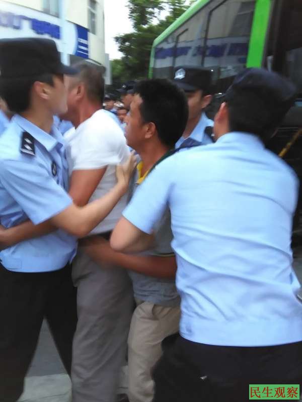 访民在现场打出各种标语表达自己的诉求,如 “电视问政莫作秀”、“暴力强拆何时休”。随着访民的增多,现场警察和截访者也更多,一时人员云集。看到访民打标语,警察冲上前将一些标语扯乱,将打标语者带走。