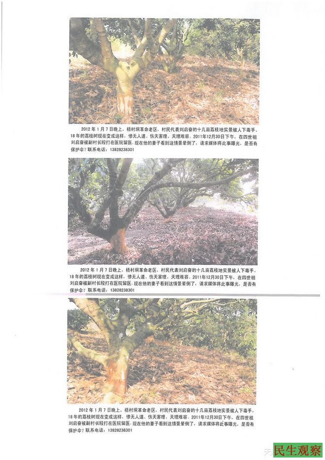 3、2012年1月3日村民代表刘启奋种植树龄已有18年的荔枝木共48棵,损失2万以上。经廉江电视台、湛江日报、晚报等曝光,影响极坏!