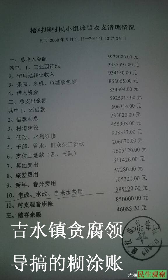9、2012年群众强烈要求选举新村长,10月份最终选出刘名高,上任后申请了湛江润泰会计师事务所审核梧村垌村10年来财务收支情况,但前任干部拒绝交出所有变卖及承包合同,只交出5年账,【即2008-2012年】,使清账组不能顺利进行工作,部分审计完毕,从审计报告发现财务管理十分混乱,贪污腐败现象十分严重,主要存在问题如下:
