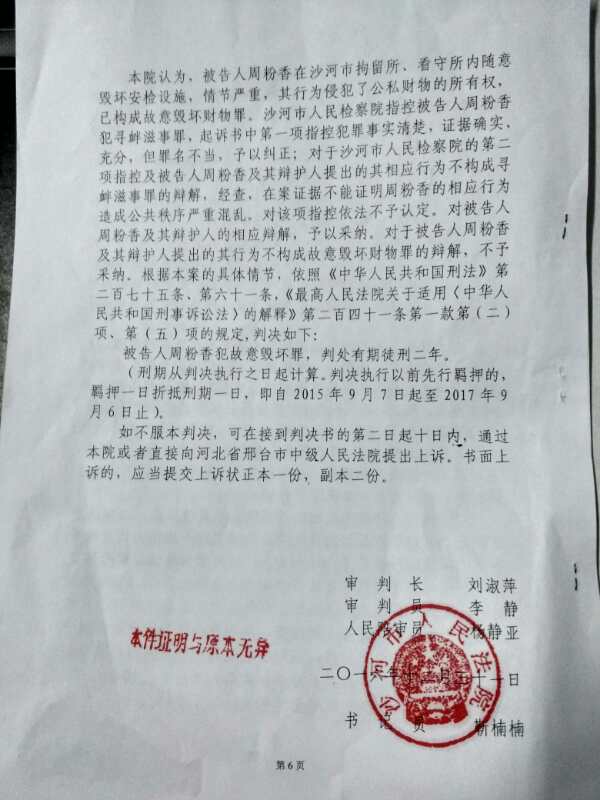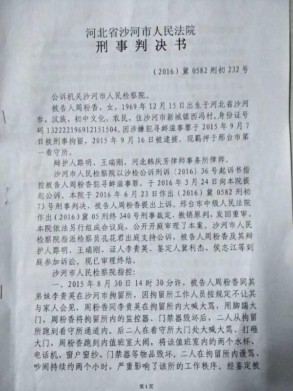 相关报道:河北沙河访民周粉香被以寻衅滋事罪判刑两年六个月